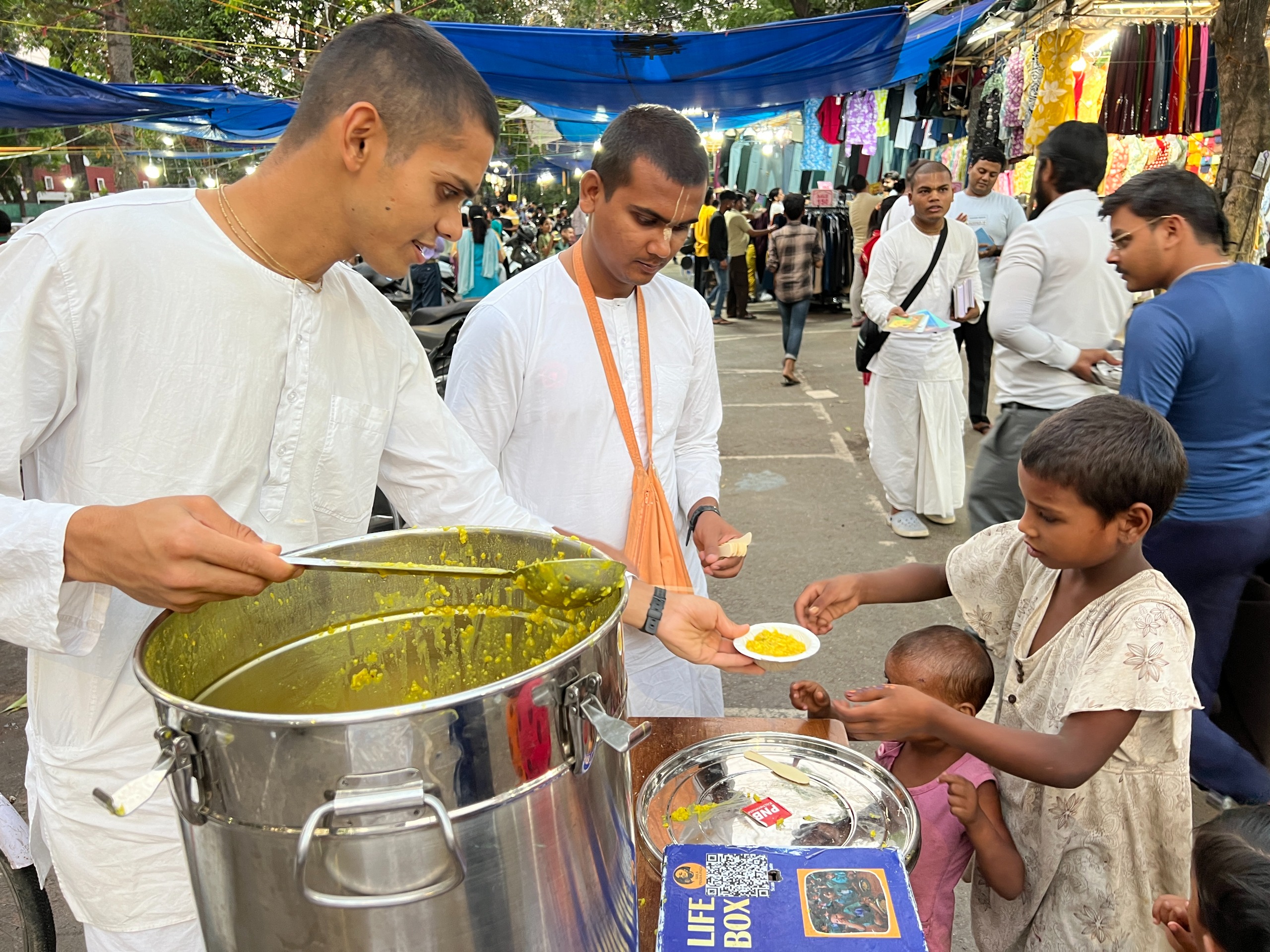 Every day, thousands of plates of sanctified vegetarian meals (*prasadam*) are served through ISKCON’s Food for Life initiative. This global food relief effort is inspired by the teachings of His Divine Grace A.C. Bhaktivedanta Swami Prabhupada—ensuring that no one goes hungry where there is a Hare Krishna temple.